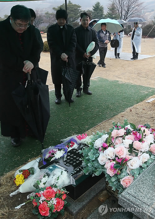 | △ 김수환 추기경 선종 6주기 추모 미사 (용인=연합뉴스) 신영근 기자 = 바보 같은 사랑을 세상에 뿌리고 선종한 김수환 추기경 6주기 추모 미사가 16일 오후 경기도 용인 천주교공원묘지 성직자 묘역에서 열려 미사를 집전한 재단법인 '바보의 나눔' 이사장 조규만 주교(왼쪽)가 추기경의 묘 앞에서 기도하고 있다. 2015.2.16 drops@yna.co.kr http://blog.yonhapnews.co.kr/geenang |