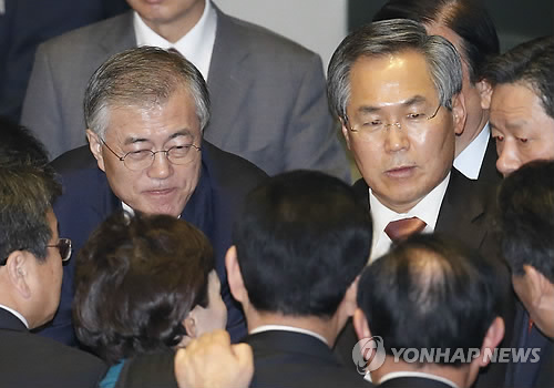 | △ 임명동의안 가결 대화하는 새정치민주연합 (서울=연합뉴스) 이상학 기자 = 새정치민주연합 문재인 대표와 우윤근 원내대표 등이 16일 국회에서 열린 제331회 국회 (임시회) 제4차 본회의에서 이완구 국무총리 후보자 임명동의안이 가결된 뒤 대화를 하고 있다. |