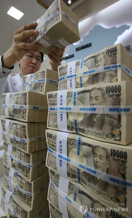 | △ 100억달러 규모 한-일 양자 통화 스와프 중단 (서울=연합뉴스) 홍해인 기자 = 한국과 일본의 재무당국과 중앙은행은 16일 100억 달러 규모로 남아있던 한일 양자간 통화 스와프를 오는 23일 만기 때 끝내며 앞으로도 필요한 협력을 지속적으로 이어간다는 내용의 합의문을 발표했다. 이날 오후 서울 중구 을지로 외환은행 본점 내 위변조대응센터에서 한 직원이 엔화를 정리하는 모습. |