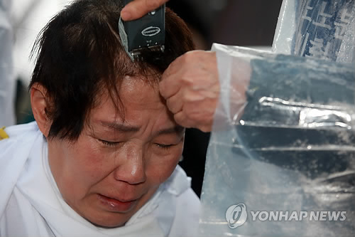 조 사무국장은 삭발 전 발언에서 "2일 후면 명절이라 손자, 손녀가 온다"며 "아이들이 '할머니 머리 왜 이래?'라고 물어도 뭐라고 대답할 수 없는 현실이 너무 비참하고 억울하다"고 눈물을 흘렸다.
