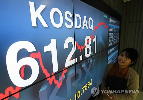 | △ 코스닥, 6년8개월만에 610선 등정 (서울=연합뉴스) 16일 서울 여의도 한국거래소에서 관계자가 코스닥 전광판 앞을 지나고 있다. 이날 코스닥은 6년 8개월 만에 610선을 돌파했다. 코스닥지수가 610선을 넘은 것은 2008년 6월 19일(610.99) 이후 처음이다. |