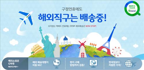(서울=연합뉴스) 고유선 기자 = 온라인 쇼핑 사이트 G마켓(www.gmarket.co.kr)과 옥션(www.auction.co.kr)은 22일까지 인기 해외직구 상품을 판매하는 '설 연휴에도 직구는 배송 중' 행사를 연다고 17일 밝혔다.