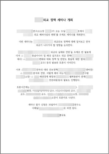 공격자는 사용자들의 의심을 피하기 위해 실존하는 대학 부설 기관을 사칭, 해당 기관이 실제로 개최했던 외교 관련 세미나 초대장 파일을 가짜로 만들고 내부에 악성코드를 숨겼다.