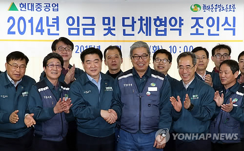 (울산=연합뉴스) 장영은 기자 = 현대중공업 노사가 2014년 임금과 단체협약에 조인했다.