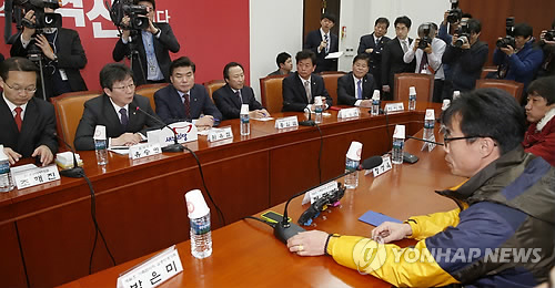 | △ 세월호 유가족 만난 유승민 원내대표 (서울=연합뉴스) 이상학 기자 = 새누리당 유승민 원내대표가 17일 오전 국회에서 열린 세월호 참사 4·16 가족협의회 관계자 면담에서 모두 발언을 하고 있다. |