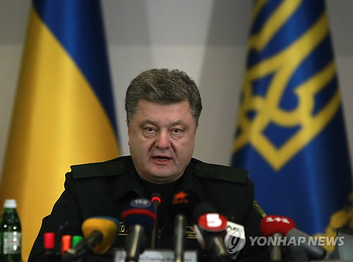 | △ 유엔 안전보장이사회가 17일(현지시간) 우크라이나 휴전 합의를 지지하는 결의안을 채택했다. 사진은 지난 15일(현지시간) 우크라이나의 수도 키예프에서 페트로 포로셴코 대통령이 국방부 관리들과의 회동 중 동부 지역 분리주의 반군과의 교전중단 명령을 내리고 있다. (AP=연합뉴스) Ukrainian President Petro Poroshenko speaks as he issues the order to start a cease-fire in the east during a meeting with defense officials in Kiev, Ukraine, Sunday, Feb. 15, 2015. The cease-fire period for fighting in Ukraine began one minute after midnight Sunday, but there are no immediate indications of whether either side in the conflict that has killed more than 5,300 people is observing it. (AP Photo/Sergei Chuzavkov) |