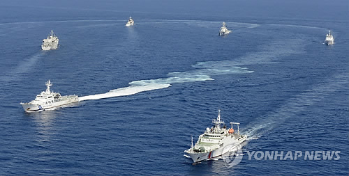 | △ 2013년 9월 10일 일본 해상보안청 순시선이 센카쿠(尖閣·중국명 댜오위다오<釣魚島>)열도 인근 수역에서 중국 해경선을 추격하고 있다. (교도=연합뉴스DB) |