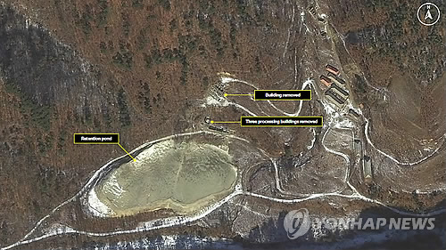 | △ 미국 전문가 `폐쇄설' 요덕수용소 "외관상 변화 없어" (워싱턴=연합뉴스) 노효동 특파원 = 미국의 북한군사 전문가인 조지프 버뮤데스가 17일(현지시간) 미국 워싱턴DC 전략국제문제연구소(CSIS)에서 열린 북한 인권대토론회에서 2011년 3월부터 지난해 12월까지 디지털 글로브사(社) 등이 촬영한 위성사진들을 토대로 요덕수용소 내부의 변화를 분석한 자료를 소개했다. 사진은 수용소내 소성리 광업지구. 버뮤데스는 지난 2013년부터 이 지구에서 광업활동이 중단됐으며 세곳의 처리시설과 한곳의 지원시설이 허물어졌다고 밝혔다. 2015.2.17 << 북한인권위원회(HRNK) 제공 >> rhd@yna.co.kr |