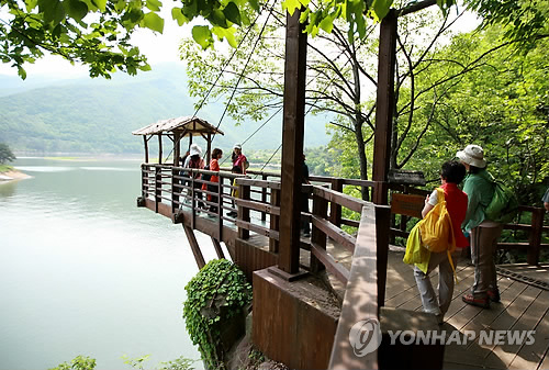 | △ 괴산호와 어우러진 산막이 옛길 (괴산=연합뉴스) 변우열 기자 = 충북 괴산군 칠성면 산막이 옛길의 전망대에서 관광객들이 괴산호의 풍경을 감상하고 있다. 괴산군은 괴산호를 내려보며 산허리를 따라 걷는 구간 전체를 친환경 나무데크로 꾸몄다. 2015.2.21 bwy@yna.co.kr |