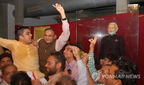 | △ 20일(현지시간) 인도 구자라트 주 수라트에서 다이아몬드 거래 업체을 운영하는 랄지 파텔(가운데 손 든 사람)이 나렌드라 모디 총리의 이름이 수놓인 정장을 4천310만 루피에 낙찰받은 뒤 환호하고 있다.(AP=연합뉴스) |