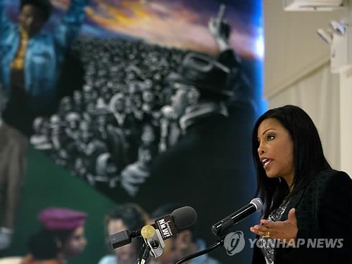 | △ 맬컴X 피살 50주년 추모행사에서 연설하는 딸 일라야사 샤바즈(AP=연합뉴스) |