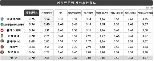 업체별 종합 만족도는 이디야가 3.75점으로 가장 높았고 이어 스타벅스·할리스커피(각 3.74점), 카페베네(3.7점), 엔제리너스(3.69점), 커피빈·탐앤탐스(각 3.64점) 순이었다.