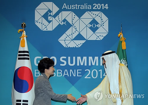 | △ 작년 11월 호주 브리즈번에서 열린 G20 정상회의 때 박근혜 대통령이 살만 압둘 아지즈 사우디 왕세제를 만나 악수하고 있다. 살만 왕세제는 올 1월 왕위에 올랐다. |