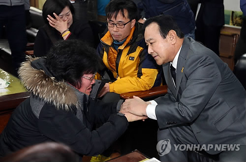 | △ 총리 앞 무릎꿇고 오열하는 세월호 실종자 가족 (안산=연합뉴스) 배재만 기자 = 이완구 국무총리가 22일 오후 경기도 안산시 화랑유원지에 마련된 세월호 참사 희생자 합동분향소를 조문한 뒤 열린 유가족과의 간담회에서 세월호의 조속한 인양을 호소하며 무릎 꿇고 오열하는 한 실종자 가족을 위로하고 있다. |