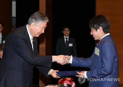 (서울=연합뉴스) 정성호 기자 = 이중근 우정교육문화재단 이사장 겸 부영그룹 회장은 23일 서울 서소문동 대한상공회의소에서 '2015년 1학기 해외 유학생 장학금 수여식'을 갖고 한국에 유학 온 외국인 102명에게 장학금을 지급했다.