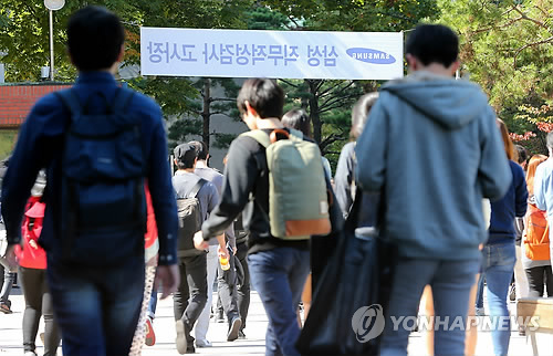| △ 주요 그룹이 다음 주부터 대졸 신입사원 공개채용에 나선다. 사진은 지난해 10월12일 삼성그룹의 공개채용 시험인 삼성직무적성검사(SSAT)를 치른 응시생들이 학교를 빠져 나가고 있다.(연합뉴스 자료사진) |