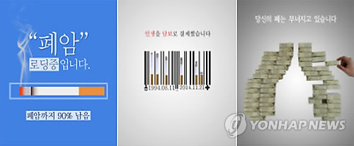 | △ 담뱃갑 경고그림 대상 수상작들 (서울=연합뉴스) 담뱃갑 경고그림 공모전 시상식 청소년·대학생·일반인 부문별 대상 수상작들. 왼쪽부터 안연수(광주서강고) 군의 작품 '그만 로딩을 멈추십시오', 대덕대 '도플갱어'팀의 '인생을 담보로 결제했습니다', 이주용(군인) 씨의 '당신의 폐는 무너지고 있습니다'. 2014.12.30 << 보건복지부 제공 >> photo@yna.co.kr |
