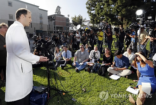 | △ UCLA 의료센터서 '슈퍼박테리아' 감염 (AP=연합뉴스) 지난 19일(현지시간) 미국 로스앤젤레스의 로널드 레이건 캘리포니아주립대(UCLA) 의료센터에서 이 병원 임상역학·감염예방센터 책임자인 자카리 루빈(왼쪽) 박사가 이 병원에서의 '슈퍼박테리아' 감염에 관해 설명하고 있다. 병원 측은 환자 7명이 슈퍼박테리아의 일종인 '카바페넴내성 장내세균(CRE)'에 감염됐으며 이 중 2명은 숨졌다면서, 환자 7명은 지난해 10월부터 올 1월까지 췌장 및 담관질환 진단을 위해 사용한 내시경을 통해 CRE에 감염된 것으로 보인다고 덧붙였다. |