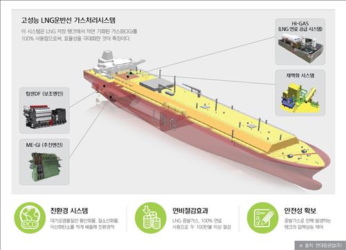 현대중공업이 2012년 세계 최초로 개발한 이중연료패키지를 비롯해 BOG(증발가스) 고압압축기, BOG 액화 시스템 등으로 구성된 가스처리시스템은 LNG 저장탱크에서 자연 기화된 가스를 100% 연료로 활용해 연비가 대폭 향상된 것이 특징이다.