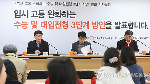 (서울=연합뉴스) 박인영 기자 = 시민단체 사교육걱정없는세상은 내달 정부의 수능제도 개선안 발표를 앞두고 24일 자체 정리한 대입제도 중·장기 개선방안을 발표하면서 2019학년도부터 수능 전 과목에 대해 절대평가를 도입할 것을 제안했다.