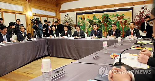| △ 제1차 당정청 정책조정협의회 (서울=연합뉴스) 진성철 기자 = 새누리당 유승민 원내대표, 최경환 경제부총리, 황우여 사회부총리, 현정택 청와대 정책조정수석 등이 25일 국회 사랑재에서 제1회 당정청 정책조정협의회를 갖고 있다. |