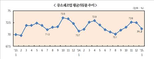 1월 중소 제조업의 평균가동률도 71.2%로 전월(72.5%)보다 1.3%포인트, 평균가동률 80% 이상의 정상가동 업체비율은 42.6%로 전월(44.1%)보다 1.5%포인트 하락했다.