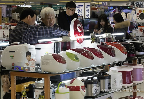 | △ 중국, 한중 FTA 가서명으로 생활가전 개방 (서울=연합뉴스) 윤동진 기자 = 한국과 중국이 자유무역협정(FTA)에 가서명한 25일 오후 서울 용산구의 한 전기밥솥 상점이 손님들로 붐비고 있다. 이날 가서명된 협정문에 따르면 한중 양국은 상품과 서비스, 투자, 금융, 통신 등 양국 경제 전반을 아우르는 22개 챕터에 FTA 타결했다. 중국은 전기전자 부문에서 전기밥솥, 세탁기, 냉장고 등 중소형 생활가전과 의료기기, 가전 부품을 개방한다. |