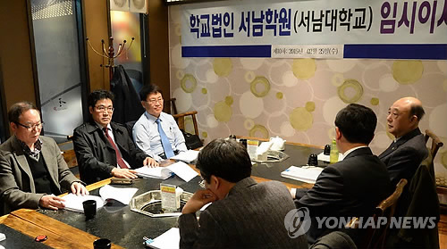 | △ 서남대 재정지원자 선정 위한 임시이사회 (익산=연합뉴스) 최영수 기자 = 관선이사로 구성된 서남대 임시이사들이 25일 오후 전북 익산의 한 웨딩홀에서 재정지원 우선협상자 선정을 위한 회의를 하고 있다. 2015.2.25 kan@yna.co.kr |