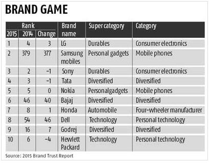 '전통의 명가' 소니가 브랜드 신뢰도 3위에 올랐고, 인도의 대기업인 타타(Tata)가 4위, 핀란드 휴대전화업체 노키아가 5위에 위치했다.