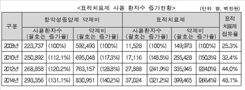 한편 지난해 기준으로 건강보험 항암제 약제비 중 표적치료제가 차지하는 비중은 48%으로, 2008년에 비해 환자수는 3.2배, 급여비용은 2.7배로 증가했다.