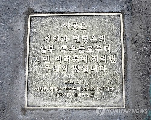 | △ 친일파 민영은 '땅찾기' 승소 기념 동판 (청주=연합뉴스) 전창해 기자 = '친일파 민영은 후손들의 토지 소송에 대한 청주시민대책위'가 청주 상당사거리에 설치한 민영은 땅찾기 소송 승소 기념 동판. 2014.3.1 jeonch@yna.co.kr |