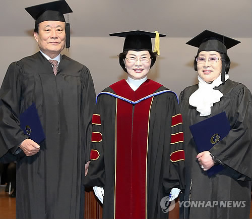 | △ (성남=연합뉴스) 26일 성남 가천대학교에서 열린 전기 학위수여식에서 경영학 학사학위를 받은 유정자(74·여·오른쪽)씨와 제광웅(73·왼쪽)씨가 이길여 총장과 포즈를 취하고 있다. 2015.2.26 <<가천대>> gaonnuri@yna.co.kr |