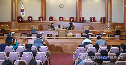 | △ 간통죄 62년 만에 폐지 (서울=연합뉴스) 임헌정 기자 = 박한철 헌법재판소장을 비롯한 헌법재판관들이 간통죄 위헌 여부 선고를 위해 26일 오후 서울 종로구 재동 헌법재판소 대심판정으로 들어선 뒤 자리에 앉아 있다. 헌재는 이날 간통을 처벌하도록 한 형법 제241조가 위헌이라고 선고했다. 헌법재판관 9명 중 7명이 위헌 의견을 내놨다. |