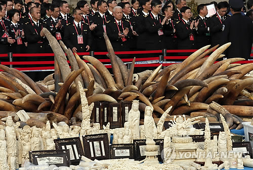 | △ 중국 세관당국이 밀수업자로부터 압수한 6t 가량의 상아와 상아 조각품 등을 지난해 1월6일(현지시간) 광둥성 둥관에서 파쇄하기에 앞서 기념행사를 갖고 있다.(AP=연합뉴스 자료사진) |