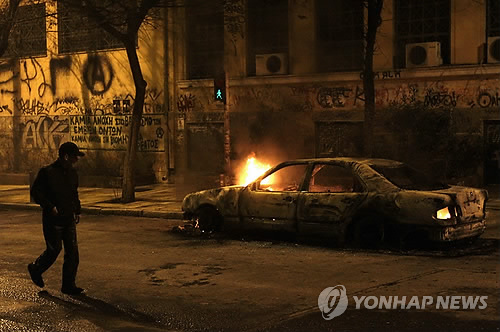 | △ (EPA=연합뉴스) 그리스 수도 아테네에서 26일(현지시간) 한 남성이 시위로 불탄 차량 옆을 지나가고 있다. |