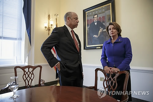 | △ 첩첩산중이네요 (AP=연합뉴스) 미국 국토안보부 잠정예산안 시한이 하루 앞으로 다가온 가운데 26일(현지시간) 제이 존슨(왼쪽) 미 국토안보부장관이 하원으로 낸시 펠로시 민주당 원내대표를 찾아 대책을 협의하고 있다. |