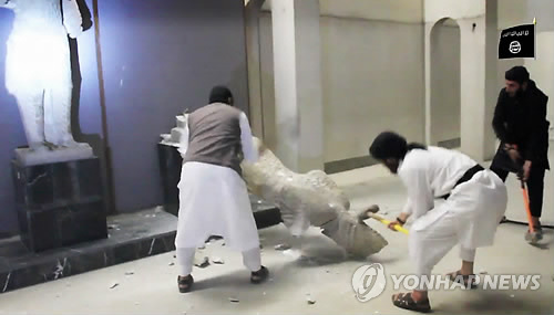 | △ IS, 이라크 모술 유물 파괴 (AP=연합뉴스) 수니파 무장조직 '이슬람국가'(IS)가 26일(현지시간) 소셜 미디어에 올린 동영상에서 캡처한 사진으로, IS 전사들이 이라크 북부 모술 소재 니네바 박물관에서 고대 유물을 해머로 부수고 있다. |