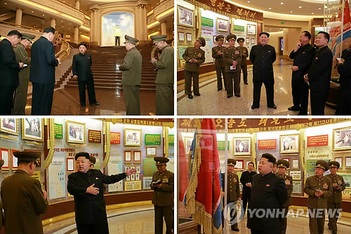 | △ 김정은 전승기념관 시찰…"전체 부대를 근위부대화" (서울=연합뉴스) 북한 김정은 국방위원회 제1위원장이 평양 조국해방전쟁승리기념관(전승기념관)에 새로 조성한 근위부대관을 방문했다고 노동신문이 28일 보도했다. 노동신문은 이날 보도에서 황병서 총정치국장의 이름을 최룡해 당비서에 앞서 언급해 시선을 모았다. 사진은 김 제1위원장이 근위부대관을 시찰하는 모습.2015. 2. 28 nkphoto@yna.co.kr |