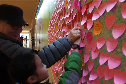 이번 전시회에서 가장 관심을 끌었던 코너는 통일 한반도 이미지를 남기는 이벤트. 세계인들에게 전하고 싶은 통일 한반도의 국가 브랜드 이미지를 직접 적어 '역사 시계' 판에 붙이고, 기념사진을 찍는 것이다.