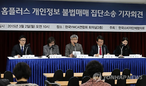 | △ 소비자단체, 홈플러스 개인정보 매매 집단소송 기자회견 (서울=연합뉴스) 최재구 기자 = 한국소비자단체협의회 관계자들이 2일 서울 명동 YWCA회관에서 홈플러스 개인정보 불법매매 집단소송 기자회견을 열고 대응방안 및 소송지원과 계획을 밝히고 있다. |