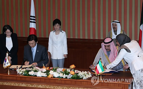 | △ 한-쿠웨이트 외교관 관용·특별여권 사증면제 협정 (쿠웨이트=연합뉴스) 이정훈 기자 = 윤병세 외교부 장관과 사바칼레드 외교부 장관이 2일(현지시간) 쿠웨이트 바얀궁에서 열린 협정서명식에서 박근혜 대통령과 셰이크 알-아흐마드 알-자베르 알-사바 쿠웨이트 국왕이 지켜보는 가운데 외교관 관용·특별여권 사증면제 협정서에 서명하고 있다. |