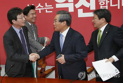 | △ 악수하는 여야 원내지도부 (서울=연합뉴스) 이상학 기자 = 새누리당 유승민 원내대표와 새정치민주연합 우윤근 원내대표 등이 2일 오후 국회에서 김영란법(부정청탁 및 금품 등 수수금지법) 본회의 처리 등에 합의한 뒤 악수를 하고 있다.왼쪽부터 새누리당 유승민 원내대표, 새누리당 원유철 정책위의장, 새정치민주연합 우윤근 원내내표, 새정치민주연합 강기정 정책위의장. |