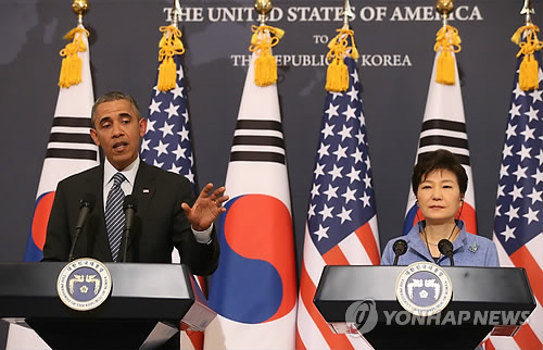 | △ 일본군 위안부 문제 언급하는 오바마 (서울=연합뉴스) 안정원 기자 = 버락 오바마 미국 대통령이 지난해 4월25일 청와대에서 열린 한-미 정상 공동기자회견에서 일본군 위안부 문제는 끔찍한 인권침해라고 밝히고 있다. 2014.4.25 jeong@yna.co.kr |