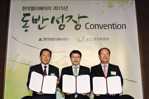 <사진 : 한상호 현대엘리베이터 대표(오른쪽)가 3일 반얀트리서울에서 열린 '2015년 동반성장 컨벤션'에서 김종국 동반성장위원회 사무총장(가운데), 장동국 현대그린테크 대표와 함께 동반성장 협약서 조인식을 가졌다.>
