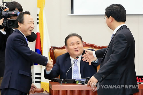 | △ 악수하는 법사위 (서울=연합뉴스) 홍해인 기자 = 3일 오후 서울 여의도 국회에서 열린 법제사법위원회 전체회의에서 일명 '김영란법'(부정청탁 및 금품 등 수수의 금지에 관한 법률 제정안)이 통과된 뒤 여야 간사인 새누리당 홍일표 의원(왼쪽)과 이상민 법사위원장(가운데), 야당 간사인 새정치민주연합 전해철 의원이 악수하고 있다. |