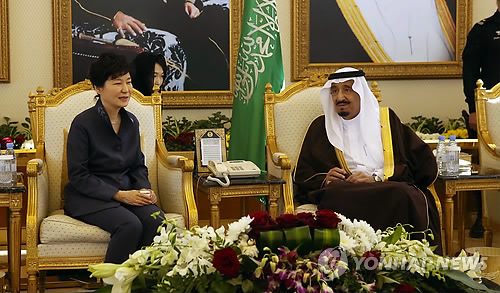 | △ 사우디 국왕과 환담하는 박 대통령 (리야드=연합뉴스) 도광환 기자 = 중동 4개국을 순방중인 박근혜 대통령이 3일 오후 (현지시간) 두 번째 순방국인 사우디아라비아 리야드 킹칼리드 국제공항에 도착, 영접나온 살만 빈 압둘아지즈 알 사우드 국왕과 환담하고 있다. |