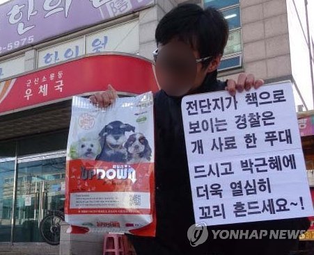 | △ 경찰에 '개 사료' 배송한 남성 (대구=연합뉴스) 박근혜 대통령 비난 유인물을 살포한 혐의로 경찰의 출석요구를 받은 한 남성이 개 사료를 경찰에 배송했다고 주장했다. 2015.3.4 <<포털 카페 게시판 캡처>> sunhyung@yna.co.kr/ |