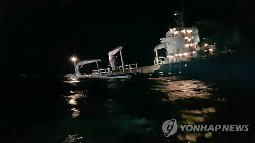 | △ 군산 어청도 앞바다 선박 추돌사고..18명 전원 구조 (군산=연합뉴스) 김진방 기자 = 4일 오후 11시15분께 전북 군산시 어청도 서쪽 15km 해상에서 홍콩 선적 4천400t급 화물선이 모래 채취선을 추돌했다. 화물선에는 선원 18명이 탄 것으로 알려졌으며, 근처를 지나던 선박들과 신고를 받고 출동한 군산해양경비안전서의 경비정에 의해 모두 구조됐다. 사진은 사고 선박 모습. 2015.3.5 chinakim@yna.co.kr |
