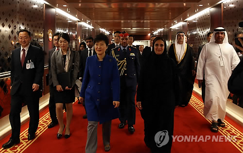 (아부다비=연합뉴스) 정윤섭 박성민 기자 = 중동 4개국을 순방 중인 박근혜 대통령은 4일 오후(현지시간·한국시간 5일 새벽) 세번째 방문국인 아랍에미리트(UAE) 아부다비에 도착했다.