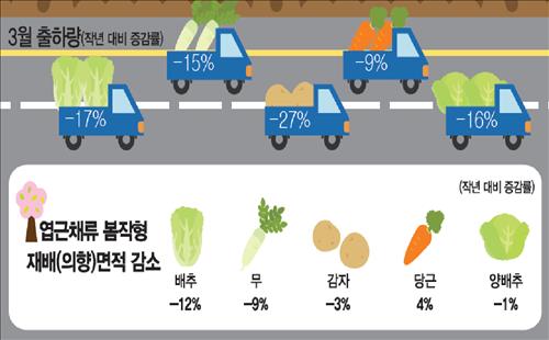 연구원 측은 "4~5월 출하되는 봄배추 재배 면적은 지난해보다 12.4% 줄어들 전망"이라면서 "올해 봄배추 생산은 평년 대비 24.0%, 지난해 대비 7.5% 감소한 20만2천여t이 될 것"으로 내다봤다.